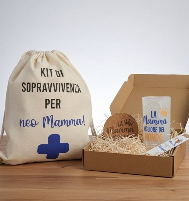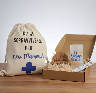 Tutto il necessario per affrontare la nuova avventura con un sorriso. Un kit ironico e ricco di amore, perfetto per celebrare la prima festa della mamma.